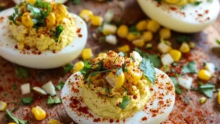 Imagine sinking your teeth into a creamy deviled egg base that is complemented by sweet, slightly charred corn and the crunch of toppings. The richness of mayonnaise is enhanced by the crumbling of cojita cheese and the umami kick of gochujang, all balanced with a note of freshness from cilantro and chives. The textures are delightful creamy yolks, crunchy toppings, and juicy corn all combine for an unforgettable eating experience.