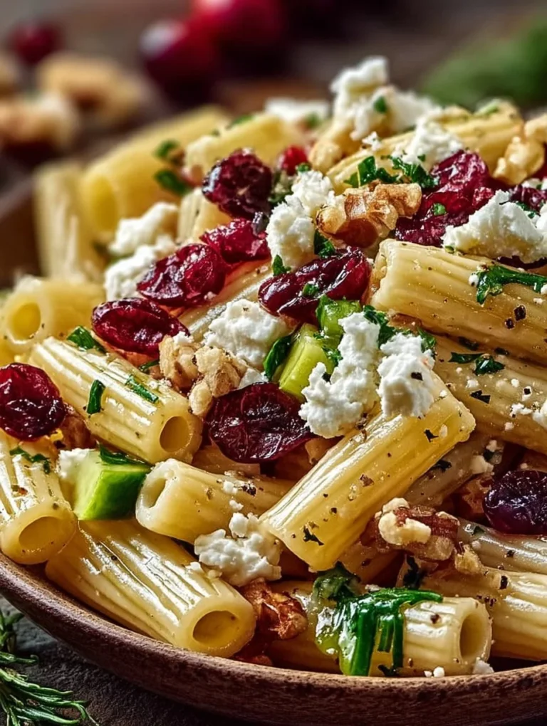 - In a large bowl, combine the cooled rigatoni, feta cheese, cranberries, cherry tomatoes, red onion, and parsley.