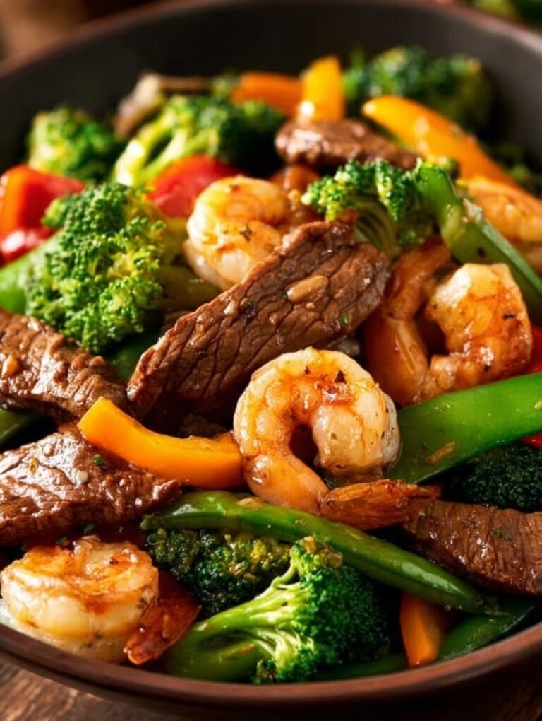Use room temperature steak and shrimp for more even searing and to keep cooking times short. Cut the steak into similar sized strips so pieces cook at the same pace and do not overcrowd the pan or you will steam instead of sear. If you like more sauce add an extra tablespoon of soy sauce and a splash of water or broth to loosen things up. Toss the vegetables in last so they stay crisp and bright and avoid overcooking the shrimp which becomes tough when left too long. For added brightness finish with a squeeze of lime or a sprinkle of sliced green onion.