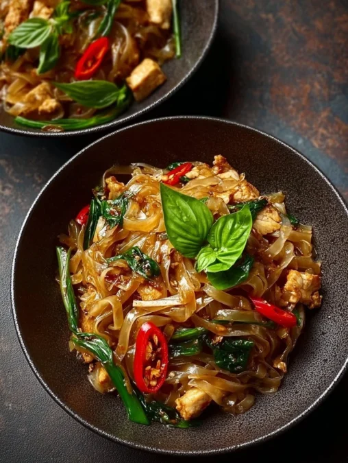 This version of drunken noodles streamlines the classic Pad Kee Mao into a weeknight-friendly stir-fry that still sings with heat and aroma. Rice noodles soak up a simple sauce of soy, oyster, and fish sauce, while crunchy broccoli, bell pepper, and carrot add lively texture and color. The quick stir-fry method locks in freshness and gives the noodles those slightly charred edges you find at street stalls. It’s flexible enough to toss in extra veggies or proteins if you like, and the basil finish lifts the whole dish with a peppery, herbaceous note. Visually it’s gorgeous on the plate—bright vegetables against glossy, saucy noodles—perfect for snapping a Pinterest-worthy photo.